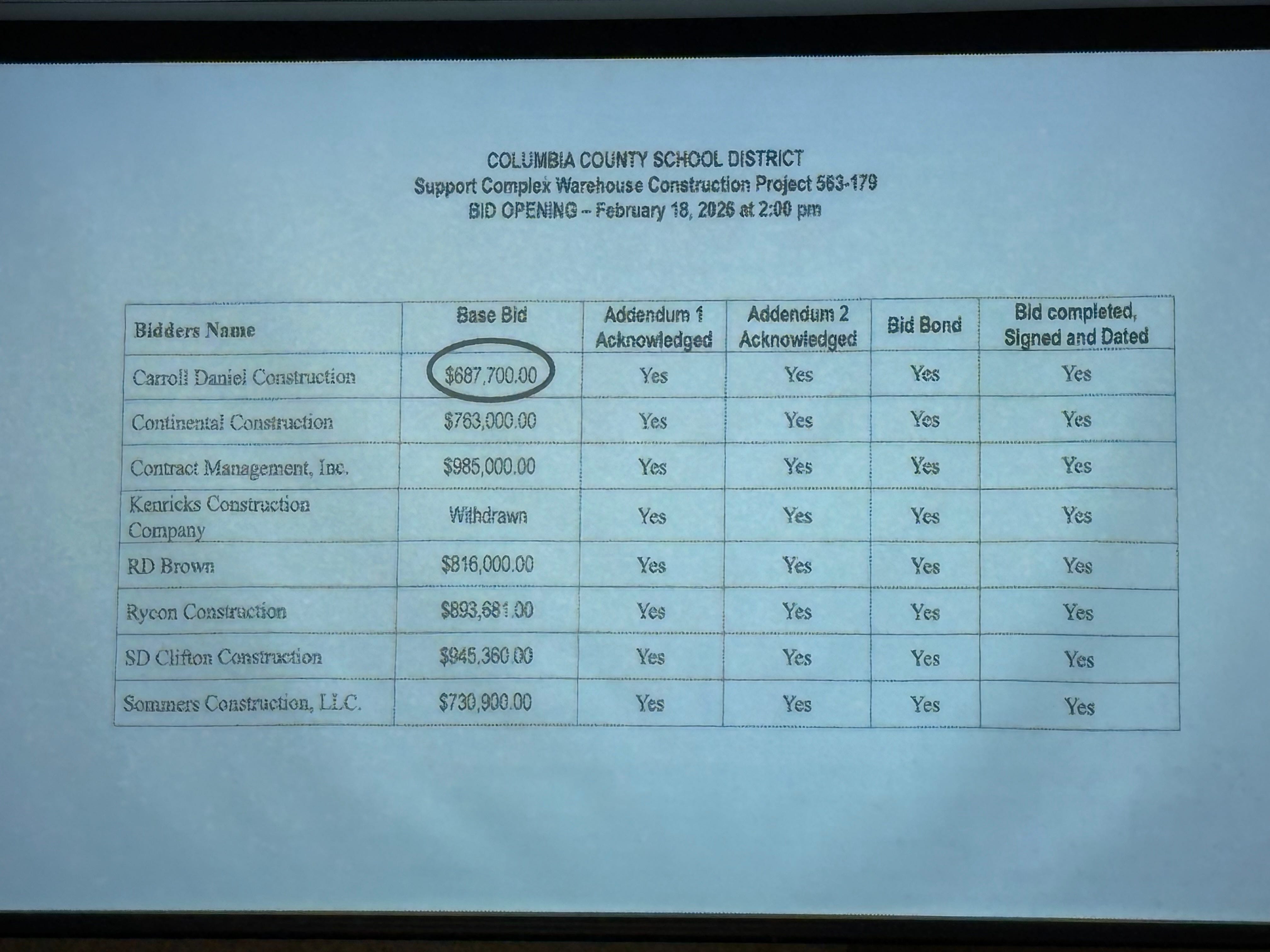 Building Program Bid Result. Approve: Yay 3, No 1 (Kent), Abstain 1 (Allen, due to lack of information)